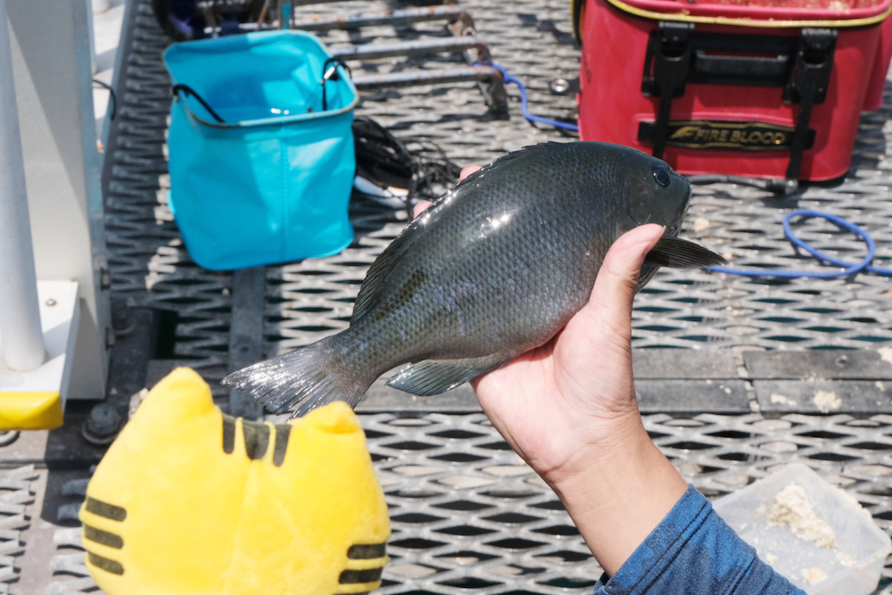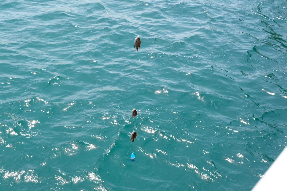 景色を眺めていたら瞬く間にヒット! 次々にスズメダイやアジ、メジナが釣れて、思わずガッツポ〜ズ!!