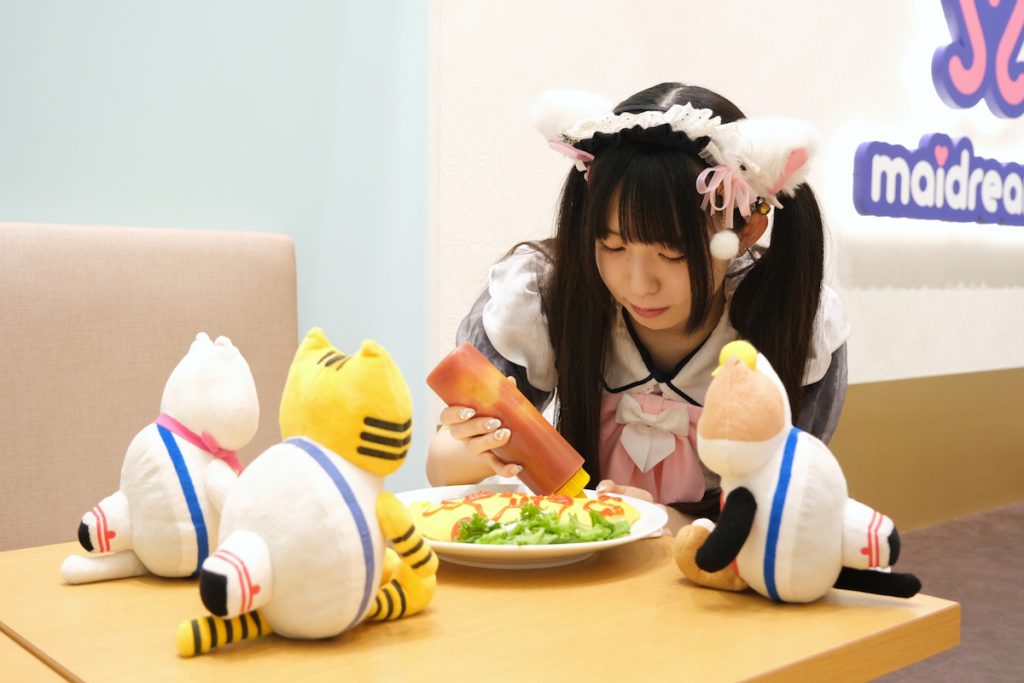 メイドさんたちが優しく丁寧に料金システムやメニューの案内をしてくれるので、初めての人も安心です。お腹がすいたふねこたちはケチャップでお絵描きをしてもらえる「プレーンオムライス」をオーダー♪