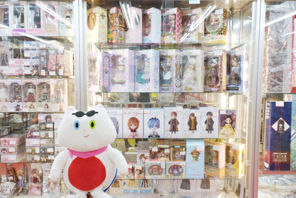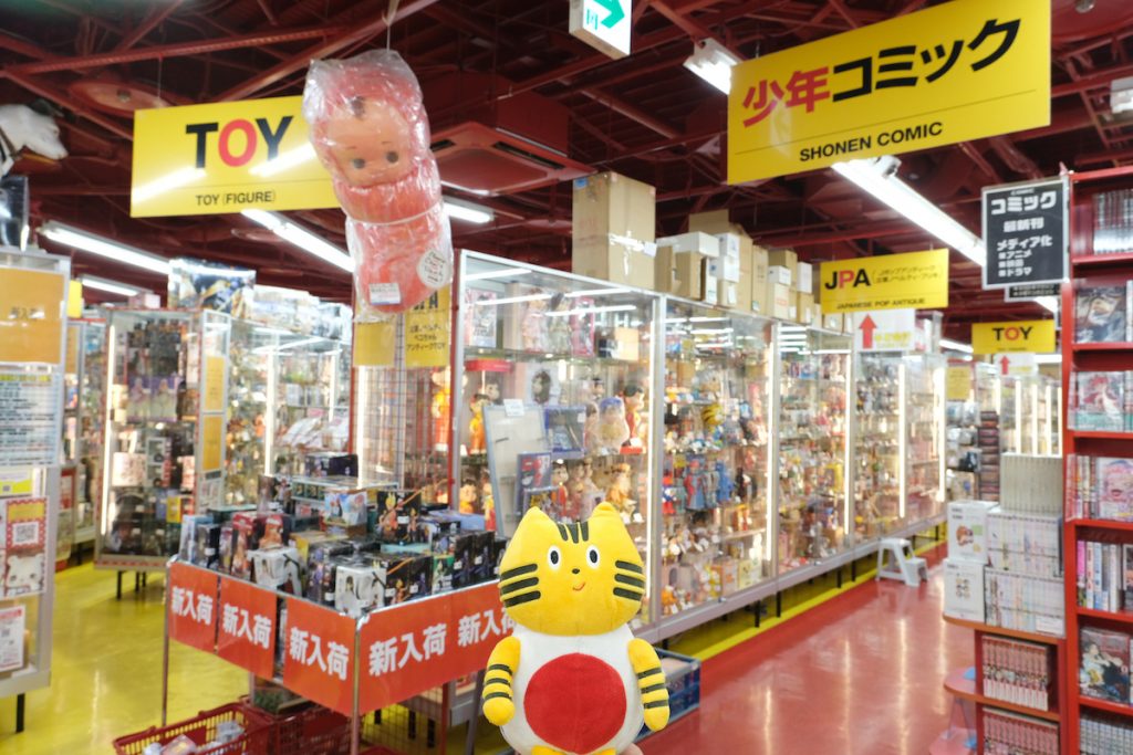 同じフロアにある『まんだらけ 小倉店』にも立ち寄ったふねこたち。ひときわ目を引くのは、ペコちゃんやニャロメなど昔懐かしいフィギュアの数々! 日本のポップカルチャーを盛り上げた名作アニメのおもちゃ、ブリキのロボット、企業のノベルティなど、今ではなかなか手に入らない希少性の高いアイテムが大集合。
