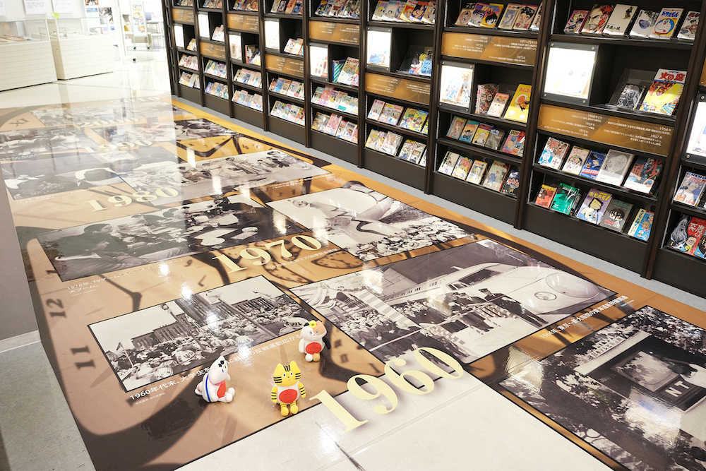 1945年から2012年の開館まで、日本の社会・歴史を振り返りながら当時流行った漫画作品を手に取れる「漫画タイムトンネル」。時代を彩った代表作の第1巻がズラリと並び、見応え満点!