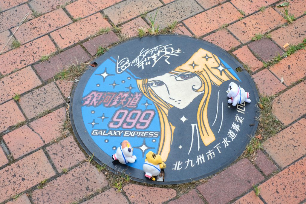 駅を降りると伝説のアニメ「銀河鉄道999」のキャラクターが迎えてくれて、メーテルや哲郎などのブロンズ像のほか、999のマンホールもまちのあちこちに点在しています。