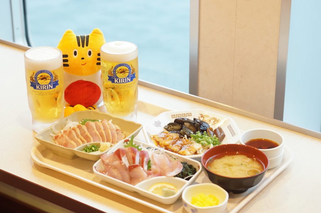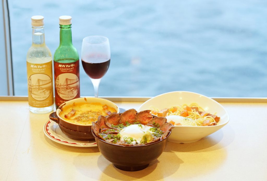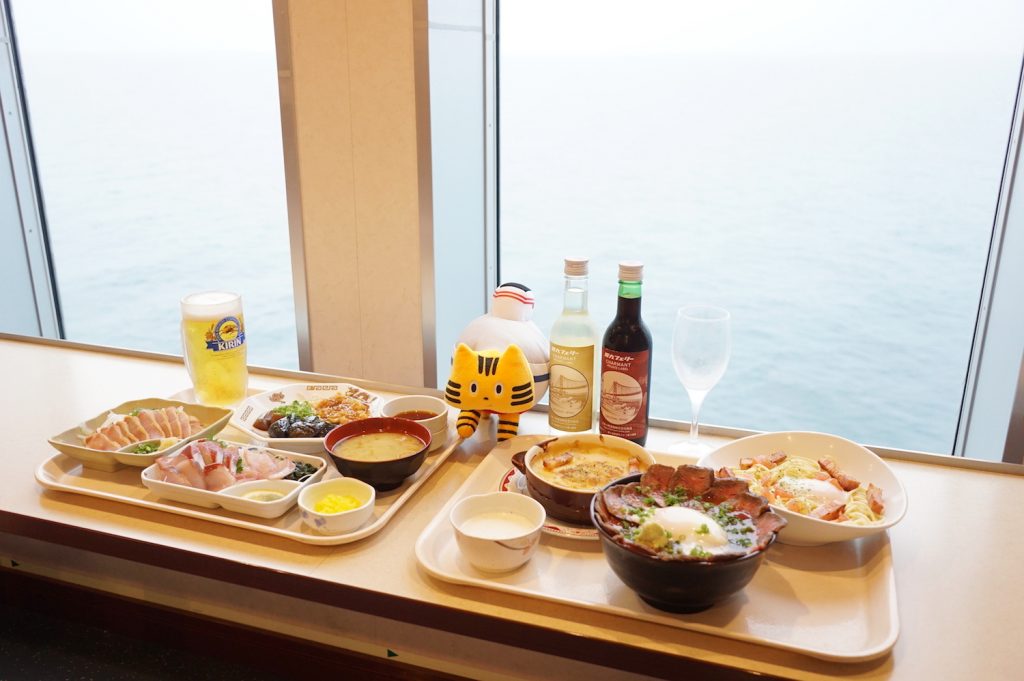 阪九フェリーは、料理長が腕をふるうバラエティ豊富な食事が自慢です。九州各地から仕入れた新鮮なブランド魚をふんだんに使い、例えば宮崎県産黒瀬ぶり、長崎県産本マグロ、関門海峡の獲れたてのタコを刺身で提供しています。他にも、地鶏のタタキなどの肉料理、九州の名物グルメの数々が勢ぞろい。