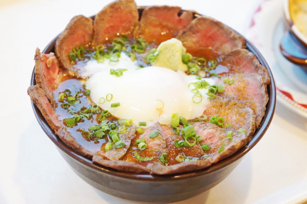 料理長の今季のイチオシは夏季限定の「冷製カルボナーラ」(500円)と、大人気「ローストビーフ丼」(味噌汁セット1800円)。柔らかなローストビーフが器からはみ出るほど盛られて、タレと温泉卵を絡めて食べるとさらに絶品! オリジナルワイン(750円)とのマリアージュも最高♪