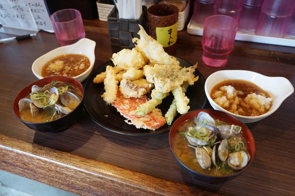 山盛りのアサリもさることながら、天ぷらの魚介類(150円〜)と野菜(100円〜)もボリューミー! サクサクの衣の食感が楽しくて、魚は身がフワッと柔らかく、野菜はみずみずしく甘味があります。早朝なのに、びっくりするくらい箸が進んで止まらない。とってもおいしい…♡