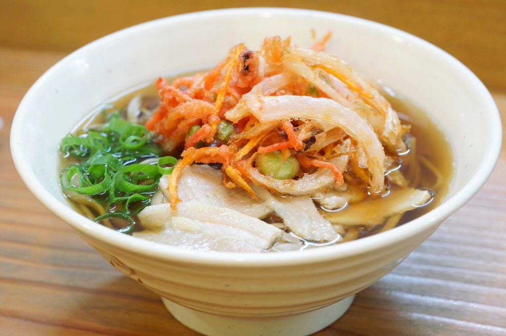 名物の「オアシスそば」(550円)は、5cmもの分厚いかき揚げとお肉がON! ちゅるんとした喉越しの平打ち麺で、サクッとランチにも打ってつけです。