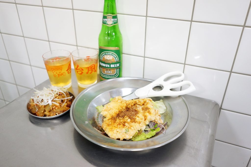 鶏ムネ肉を使った巨大な台湾流フライドチキン「チョキチョキチーパイ」(550円)はマストオーダー。香ばしくてスパイシーでビールに合うんだな♪