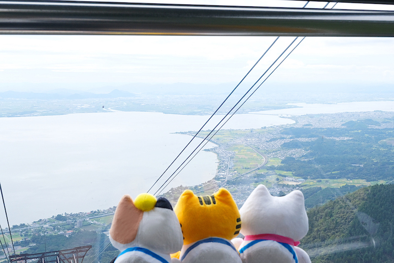 『びわ湖テラス』まではロープウェイでぐい〜んと登っていきます。秒速12mの日本最速を誇るロープウェイとあって、上へ上へとぐんぐん進み、街並みとびわ湖がズームアウトするように遠くなっていく… この臨場感がたまりません♪