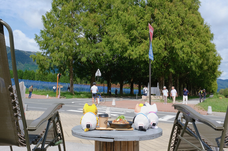 敷地内にはカフェやレストラン、お土産ショップ、芝生広場など、メタセコイア並木を眺めながら寛げるスペースも充実。その中の一つ、『並木カフェ メタセコイア』に入店したふねこたちは、ラッキーなことにテラスの特等席をゲットできました♪