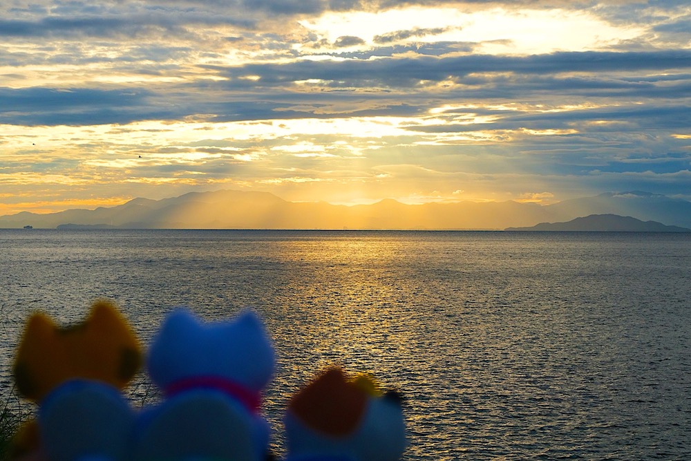 湖西エリアはびわ湖から登る朝日が美しいと話題。そこで、日の出の瞬間をひと目見ようと、ふねこたちは早起きをして湖のほとりへ。