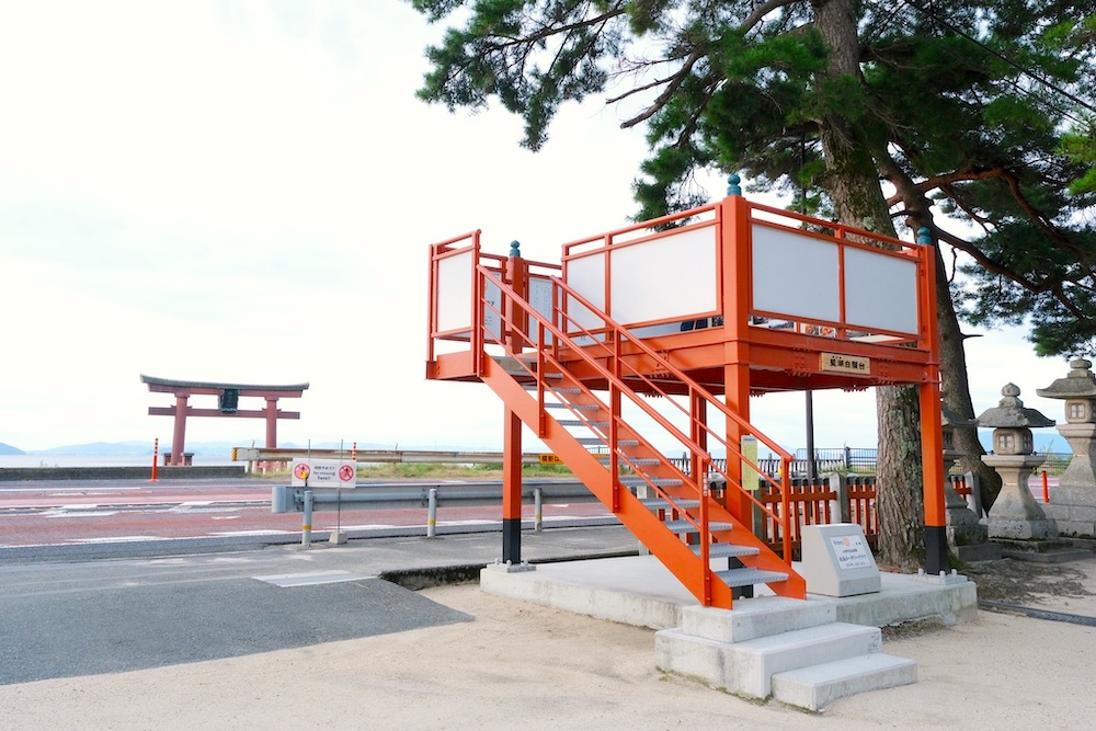 人気の景勝地にもなっている白鬚神社ですが、目の前の国道161号線は交通量が多く、湖側への横断は大変危険なので、湖中鳥居を撮影する際は社務所前に設置された展望台「藍湖白鬚台(おうみしらひげだい)」を利用しましょう。