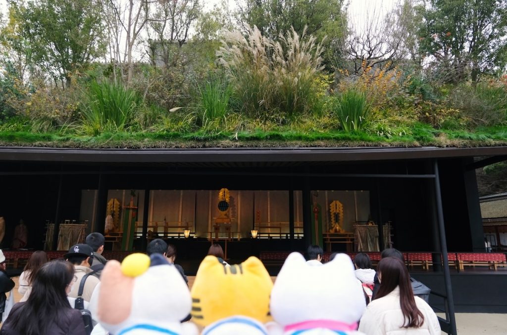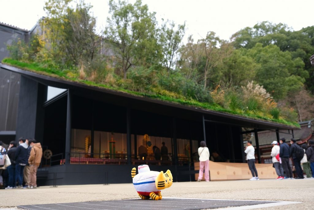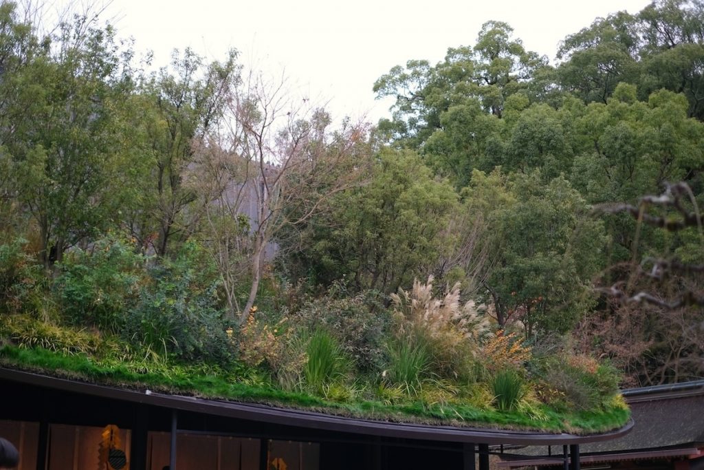 屋根に青々と茂る植物の佇まいが印象的。このデザインは、道真公を慕う梅の木が一夜のうちに大宰府まで飛来した“飛梅伝説”から着想を得たもので、豊かな自然が本殿前に飛翔し、屋根に森が現れるというコンセプトだそうですよ。