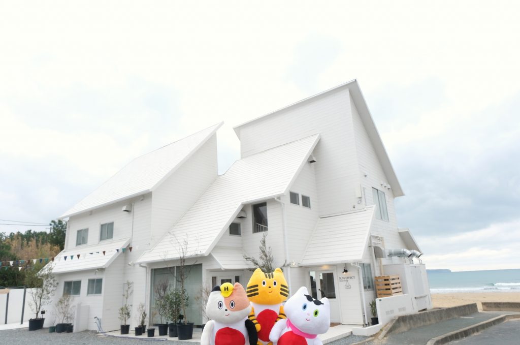 実は、ふねこたちの福間海岸でのお目当ては別にあり、それは海を眺めながらサウナを満喫すること! そんな夢のようなサ活体験を提供するのが、2023年秋にオープンした話題の複合型施設『SUN EFFECT(サン エフェクト)』。福間海岸の目の前に建ち、真っ白な外観が目印です。