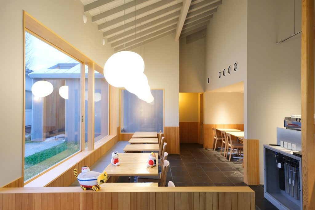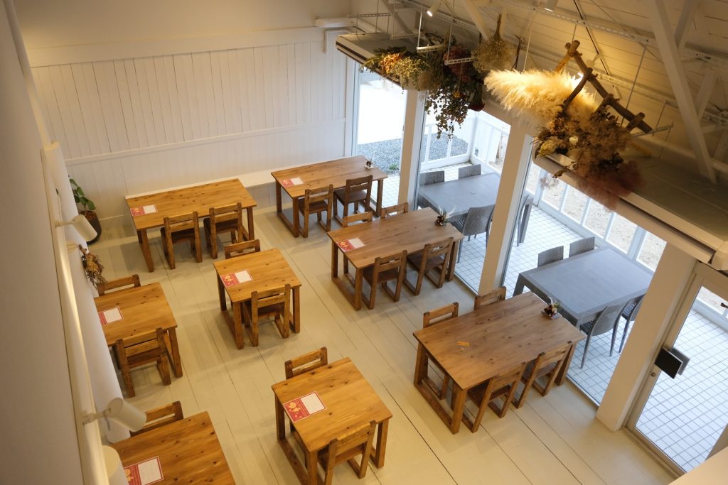 大きな窓と吹き抜けの開放感、木の温もりと調和するグレートーンのアクセントがおしゃれ。お店に入った瞬間、ふぅ〜と落ち着ける居心地のいい空間です。