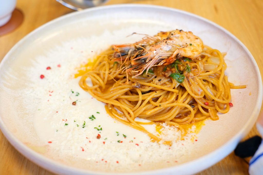 この日は「海老とキノコのビスクパスタ 蕪とカリフラワーのソース」で赤と白のバイカラーで彩られていました。海老が丸ごとのった贅沢な魚介パスタで、香味野菜のアクセントもGood! 深いコクと香りが食欲をそそり、本格派の味わいにふねこも感動。