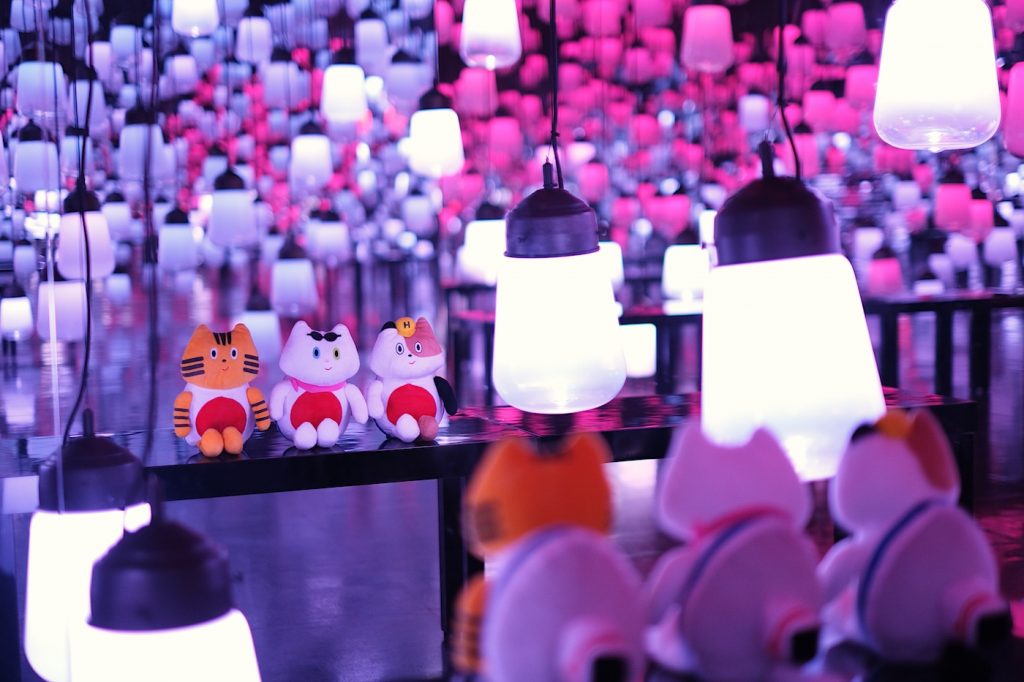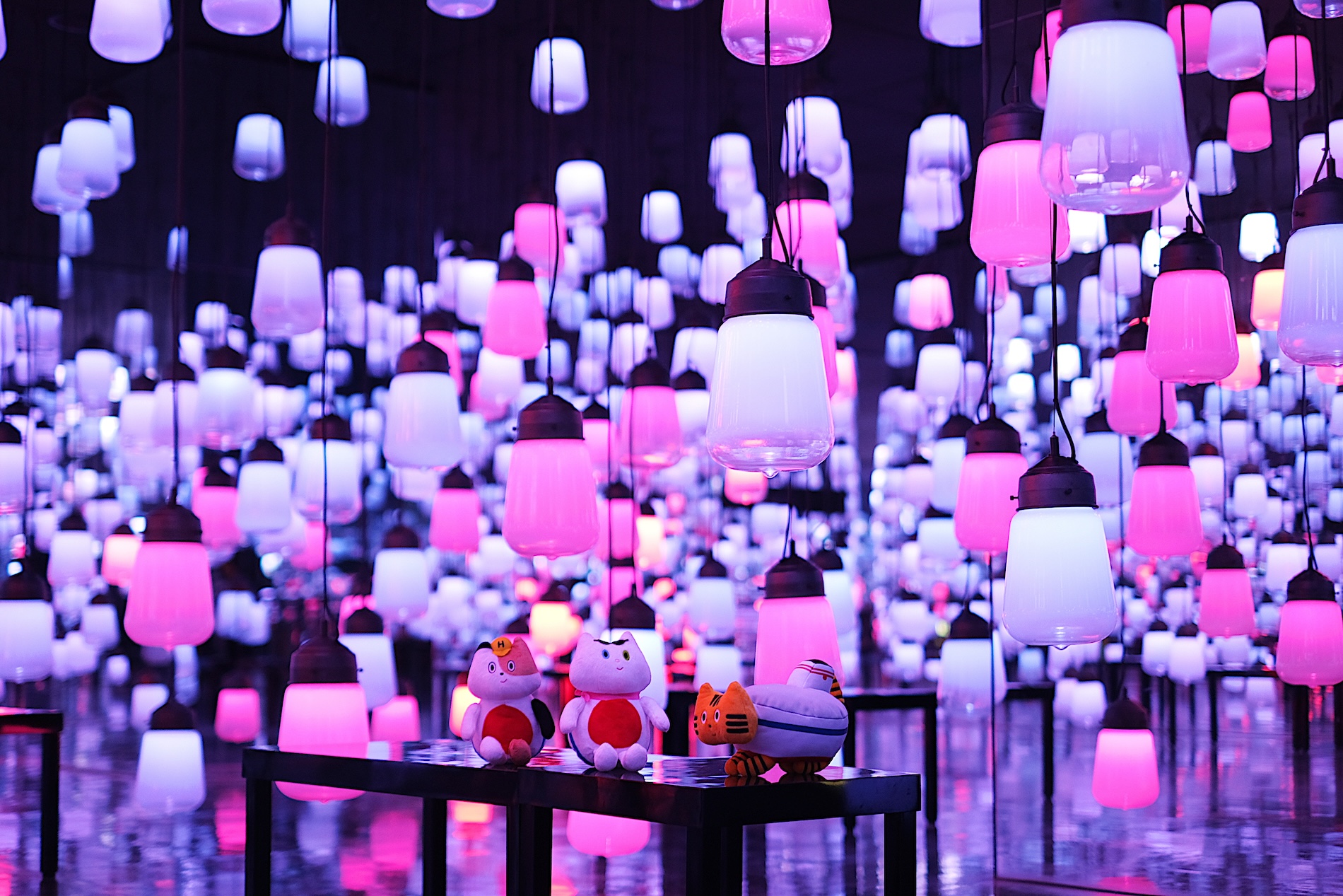 これはアート集団・チームラボが手がける常設展示『森の中の、呼応するランプの森とスパイラル ― ワンストローク』という作品で、ホテルのエントランス全体が展示空間となっています。どこまでも続く幻想的なランプの光は、季節によって色が変化。ミラー越しにセルフィーを楽しむ人も多く、ふねこたちも自撮りをパシャリ♪