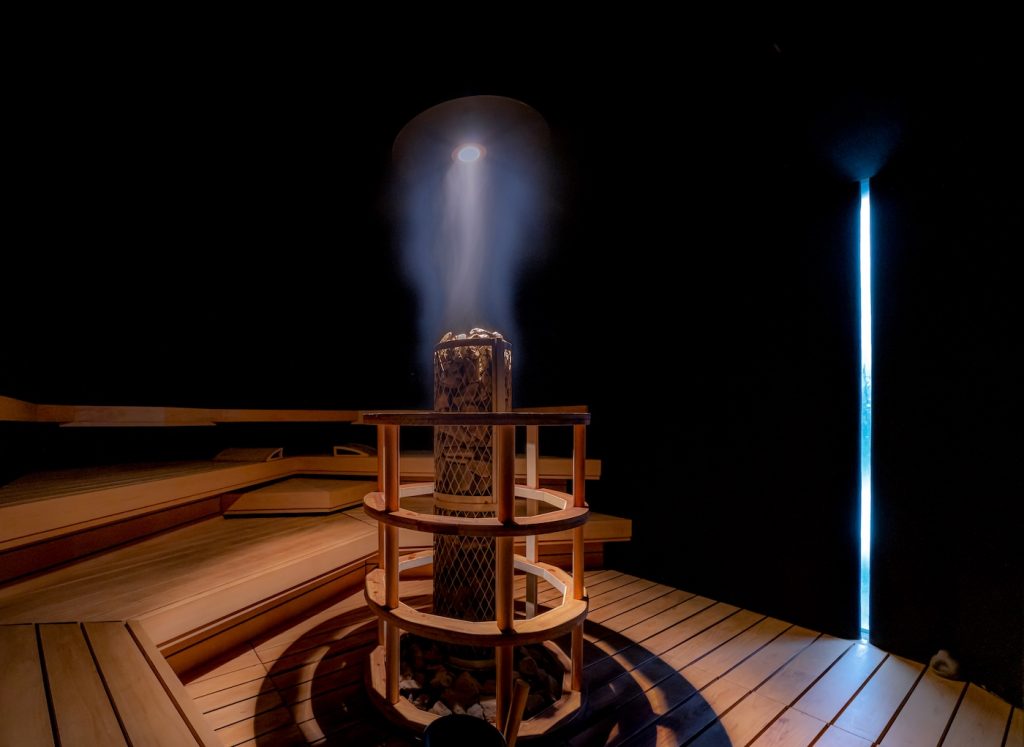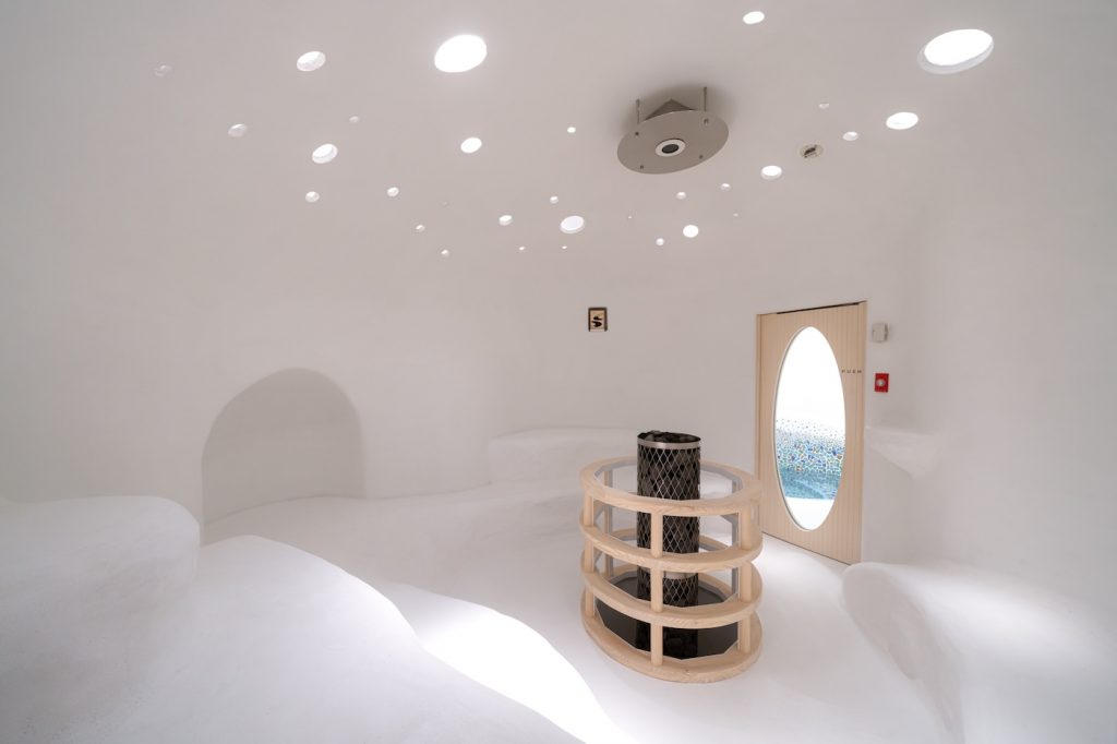 雪のかまくらのような真っ白なサウナ室が印象的で、香り豊かなアロマボール(アロマ水の氷)を使ったクーゲルでセルフロウリュが可能です。アロマボールをサウナストーブに投入すると、蒸気とともにアロマの香りがふわり。壁にぽっこりと空いた穴に入れば、ひとりの世界に集中して、より深くメディテーションを楽しめます。