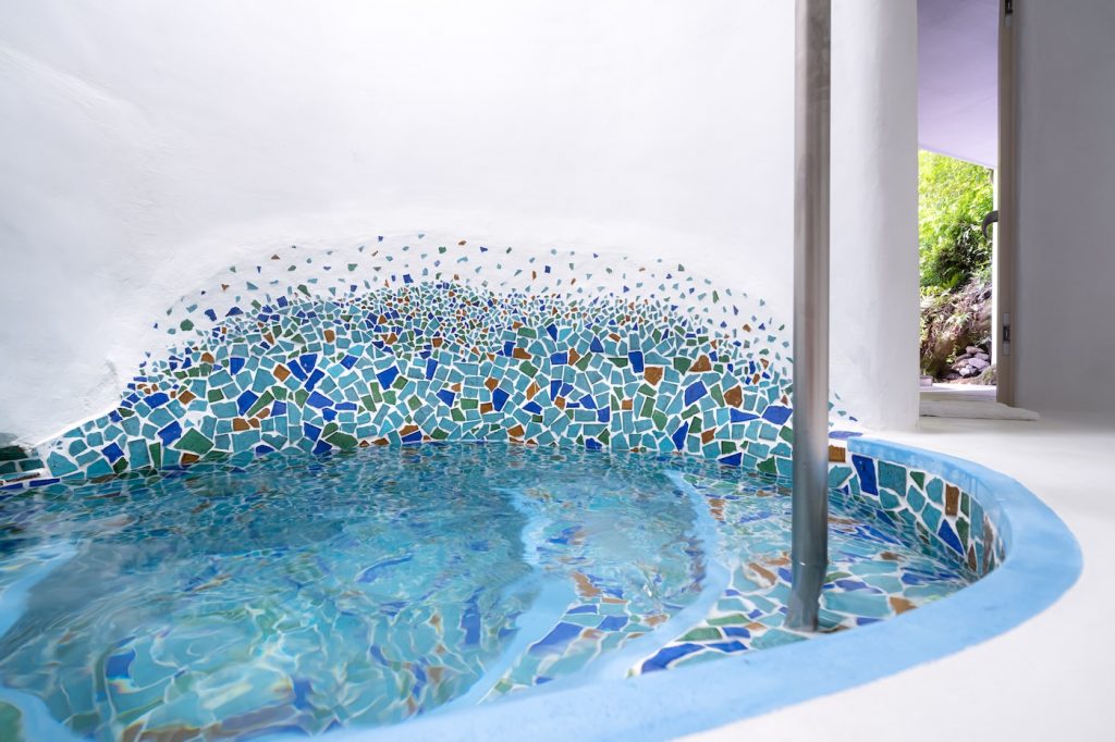 モザイクタイルの水風呂もすてき! 美肌の湯としても有名な武雄温泉の水風呂で、毛穴がキュッと引き締まりお肌もすべすべに。