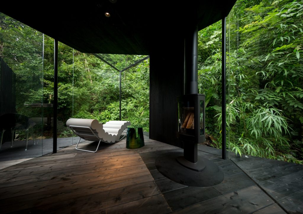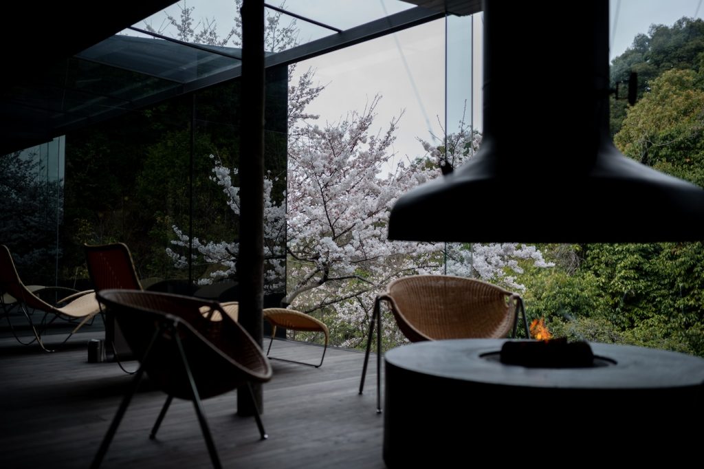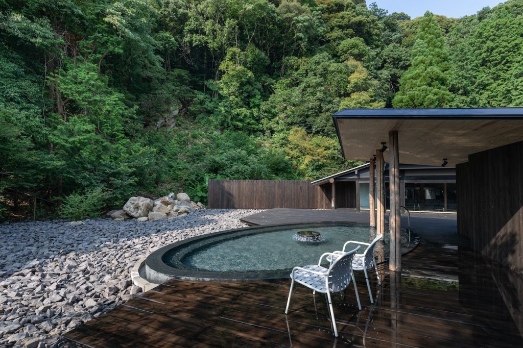 汗をたっぷりかいたら、御船山の自然を愛でながら水風呂&外気浴を! 女湯と同じように2階に休憩&喫茶室があり、冬季は暖炉の火を眺めながら寛ぎの時間を過ごせます。