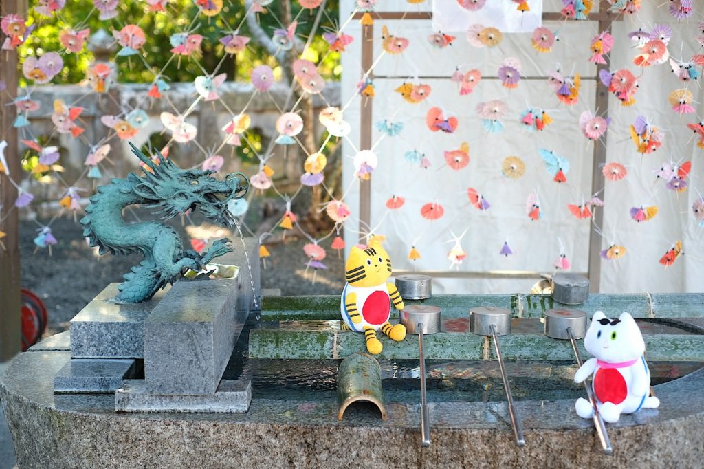 手水舎に龍の飾りを発見。辰年にぴったりで縁起が良いですね。和傘の装飾も風情があって絵になります♡