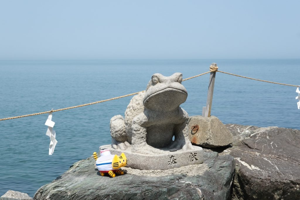 その慣わしに従って、お伊勢さん参りの前に伊勢湾に佇む『二見興玉神社』へ訪れました。潮風が気持ちよくて景色も爽快です…! おやおや? 鳥居の袂にカエルの石像が鎮座していますね。