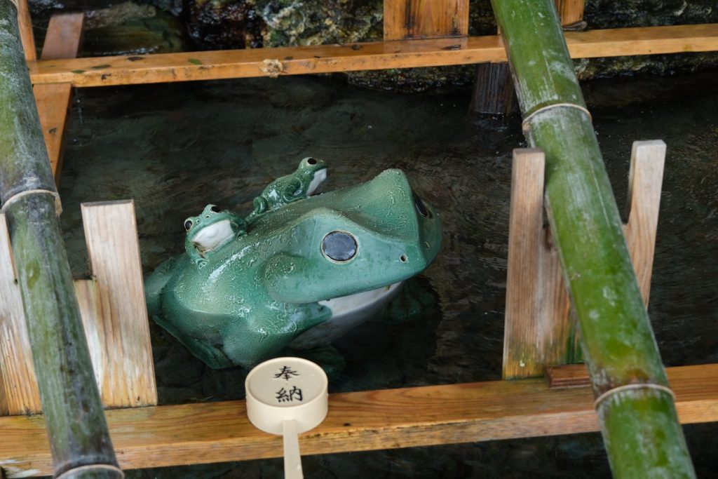 手水舎には水浴び中のカエルの親子が! この満願蛙に水をかけることで願いが叶うとも言われています。