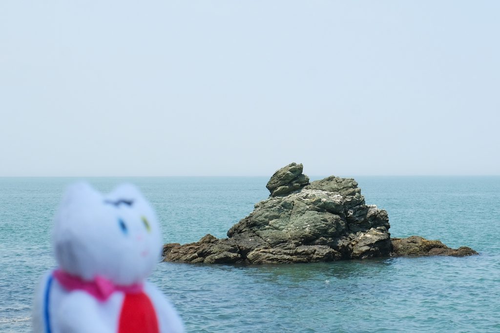 夫婦岩をバックに、カエルさまと記念写真をパシャリ! 無垢塩祓いを済ませ、爽やかな青空と海を眺めていると、気持ちまで清らかになってきます〜!
