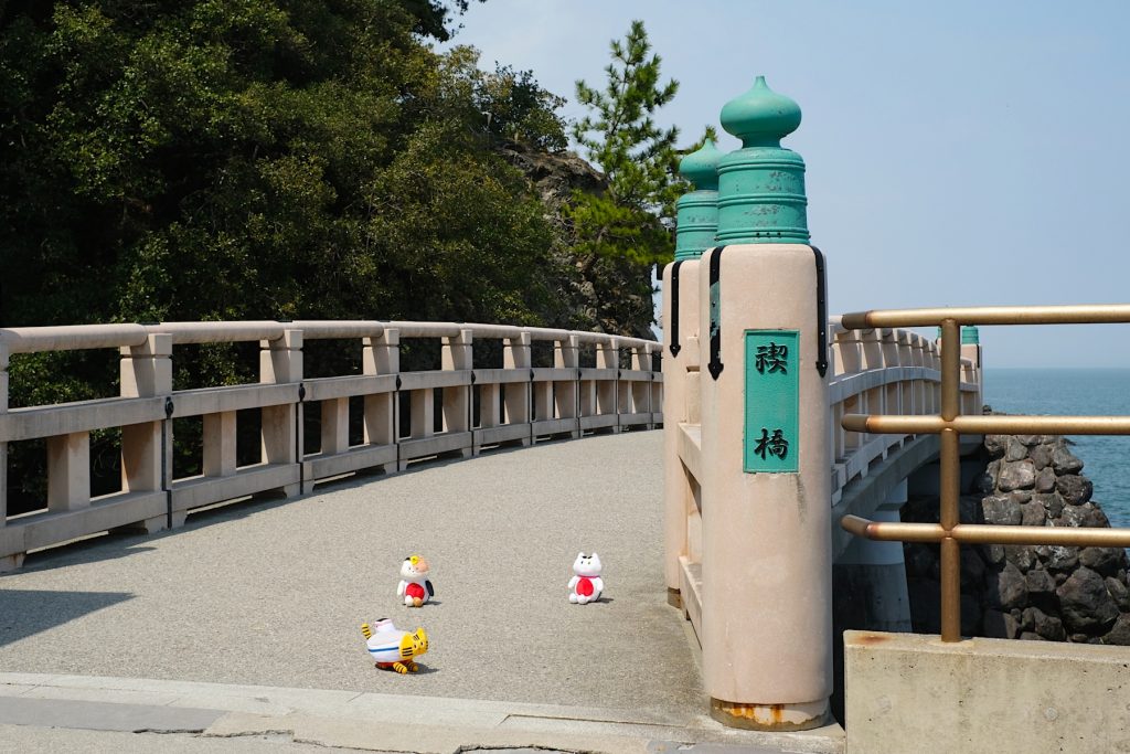二見興玉神社の祭神である猿田彦大神の神使が蛙(カエル)ということで、境内にはカエルの置物がたくさん並んでいます。また、カエルの語呂にちなんで「無事に帰る」「貸した物が還る」「お金が返る」といった縁担ぎの意味合いも込められているそうですよ。ふねこは元気に旅から帰ることをお祈りしましょう♪