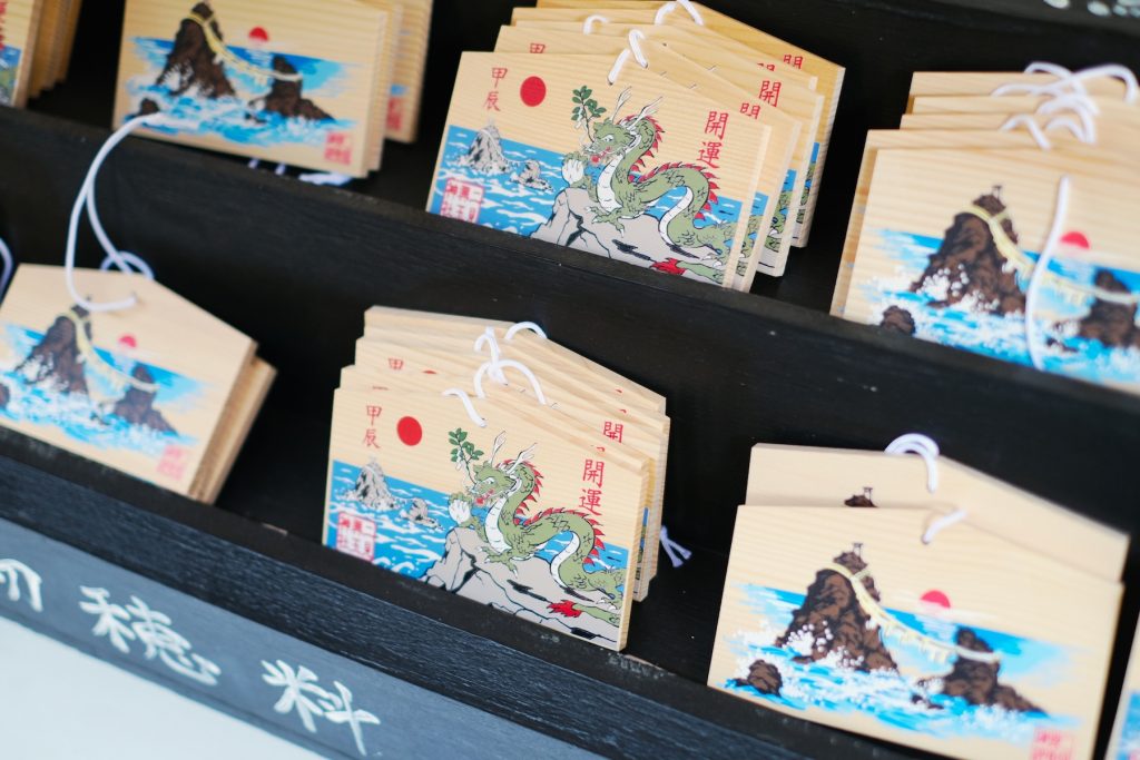 本殿の奥へ進むと「日の出遥拝所」があり、鳥居の下に置かれた小さな輪注連縄(300円)で体をさすると、けがれを取り除いて身を清めてくれるのだとか。
