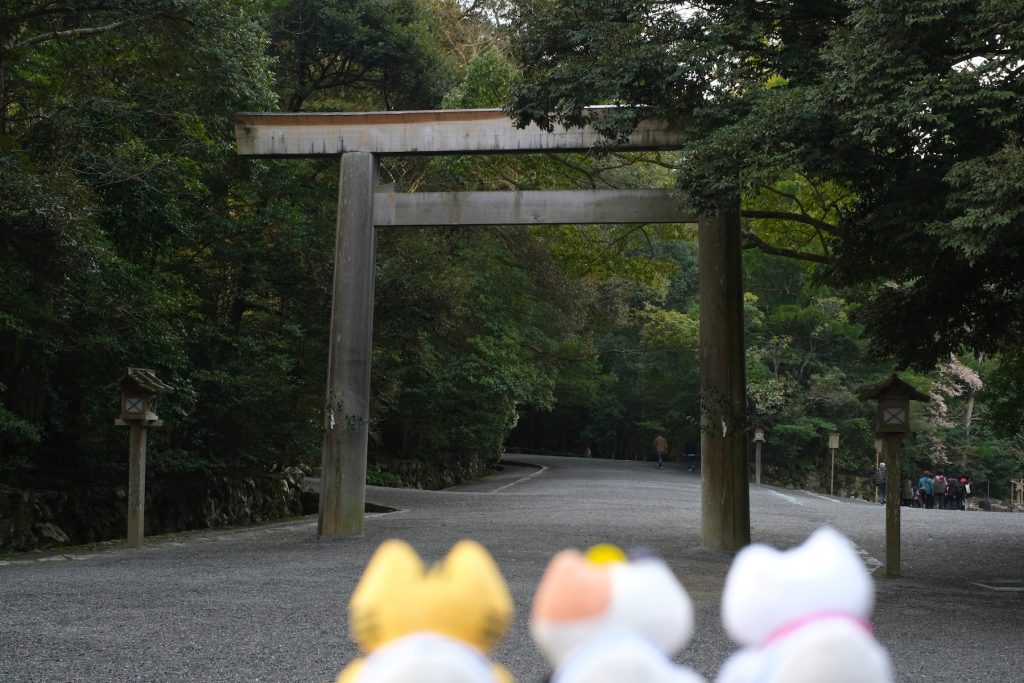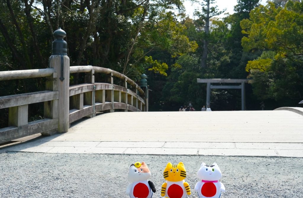 外宮から約5km(車で約10分)の場所に鎮座する『皇大神宮(内宮)』へやってきたふねこたち。五十鈴川(いすずがわ)にかかる全長101.8mの宇治橋を渡って神域へと向かいます。この橋は俗界と聖界をつなぐ架け橋だそうですよ。