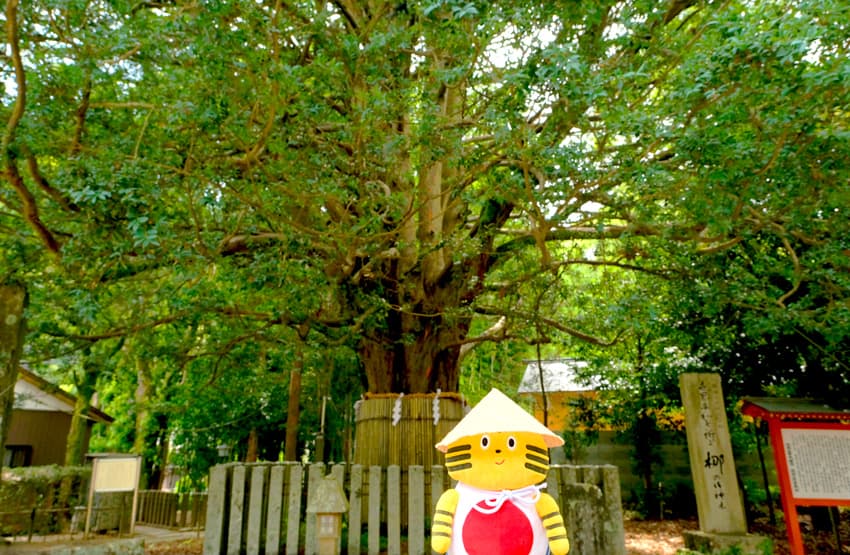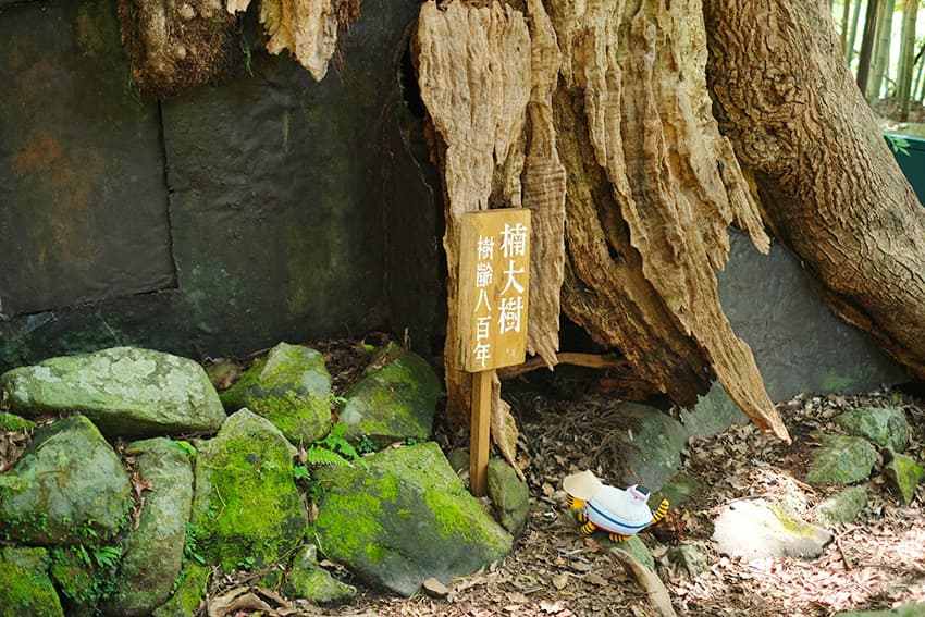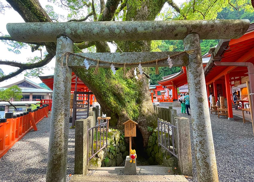 礼殿横に⽴つ御神⽊は、樹齢850年(推定)の巨⼤な樟。⾼さ27m、幹回り約8.5mを誇り、根元の⼤きな空洞に⼊って無病息災を祈る「胎内くぐり」を体験できます。