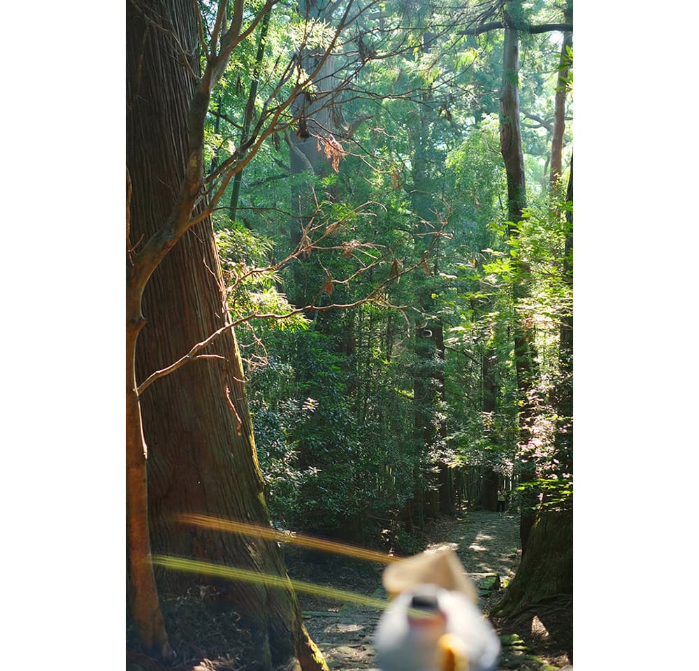 鬱蒼とした⼭道では樹齢800年を超す⽼杉も発⾒。⽯段が続くので体⼒を使いますが、⽊漏れ⽇が差し込むと景⾊がさらに美しくなり、疲れが吹き⾶びます。せつこもがんばれ〜!
