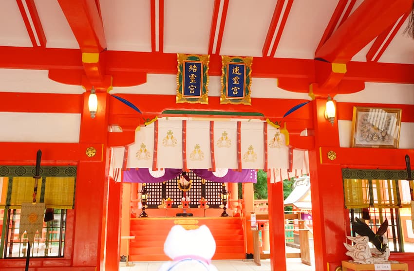 ⽇本で初めて夫婦となった2⼈の神様を主祭神として祀っていることから、縁結び、夫婦円満、家庭円満などのご利益があるそう!ふねこたちも⼆礼⼆拍⼿⼀礼で、神様にご挨拶。