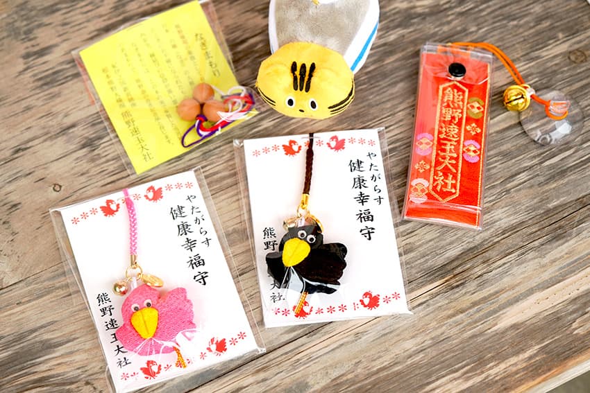 授与所でお守りを購⼊したふねこたち。「健康幸福守」のデザインがキュートでお⼟産に喜ばれそう♪写真右の「なぎまもり」(左上)は旅の安全にもご利益があるナギの実のお守りです。