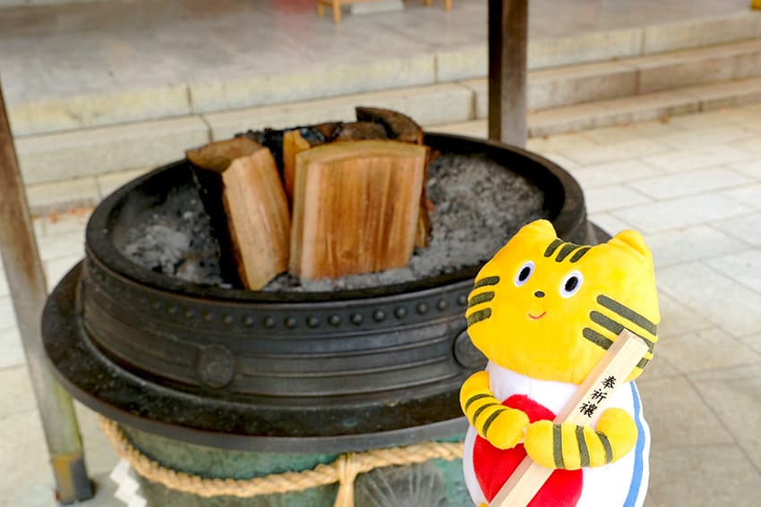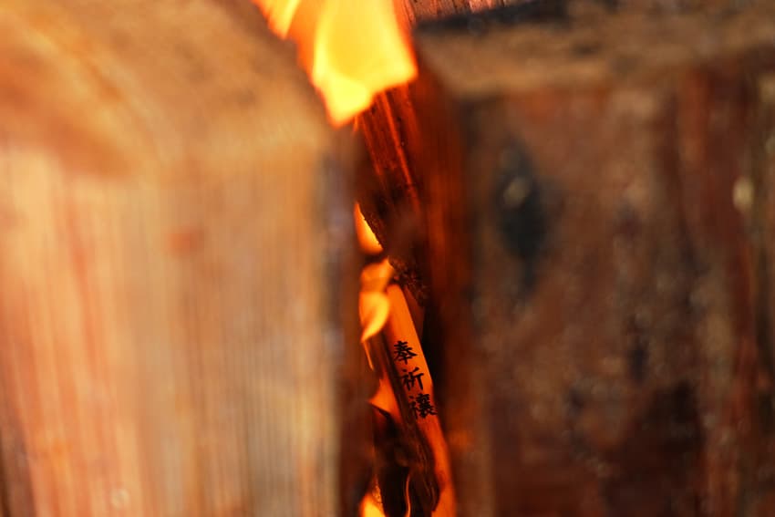 ふねこは参拝の前に、護摩⽊に願いを込めて燃え盛る⽕に投じました。ふねこの願い事が気になりますね…!