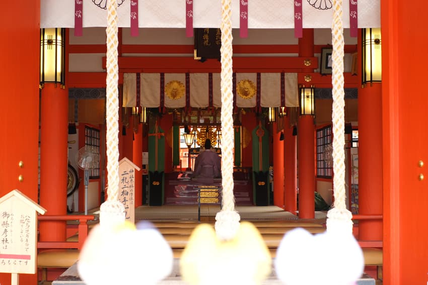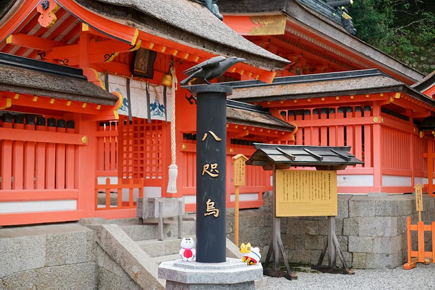 拝殿には導きの神・⼋咫烏の置物も飾られています。鮮やかな朱⾊の社殿が本当に麗しいですね。