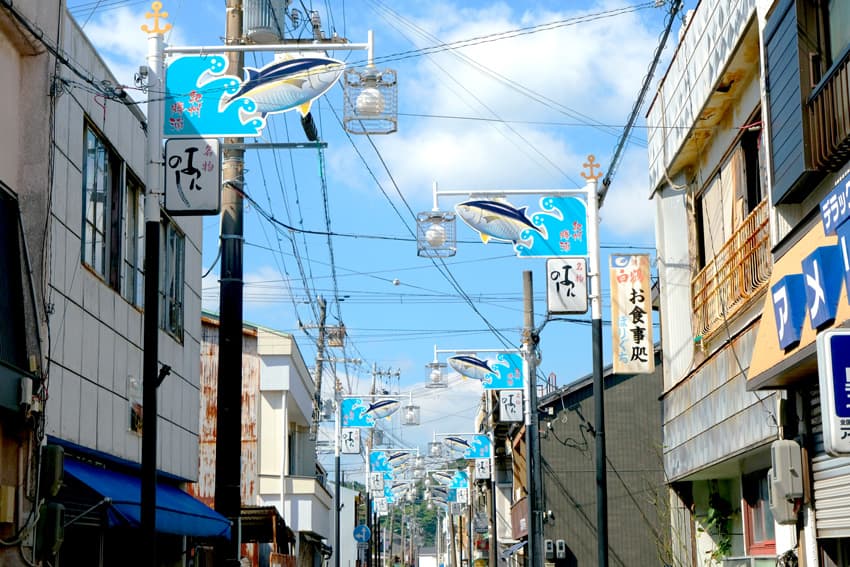 特に延縄漁法による⽣鮮マグロの⽔揚げ量は⽇本⼀を誇り、「⽣マグロのまち」と呼ばれています。港付近にはマグロ料理を楽しめる飲⾷店が軒を連ね、⾷堂やレストランでは新鮮なマグロの刺⾝や寿司、丼物を⼿軽に味わえます。