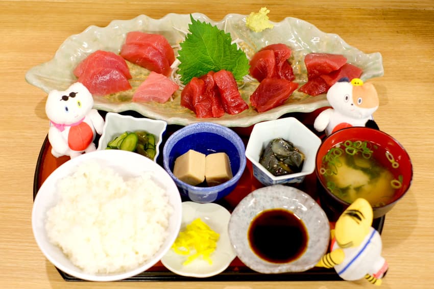 「⽣マグロのまち」に来たからにはやはりお刺⾝を⾷べておかないと!お⿂⼤好きふねこも「⽣まぐろお造り定⾷」を⽬の前に釘付け状態…!