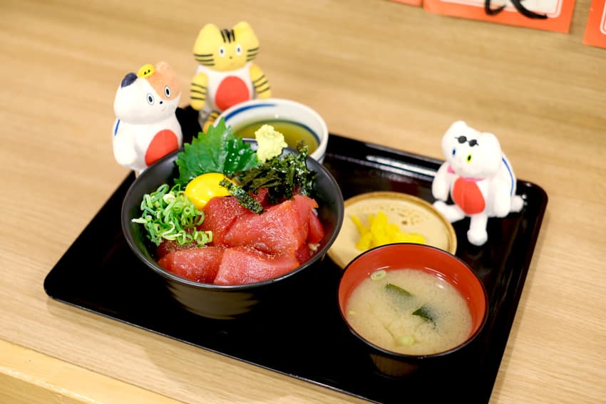 早朝からマグロを使った海鮮丼や刺⾝定⾷を提供する飲⾷店があるのも、港町ならでは。ふねこたちが訪れた『ハーバー⾷堂 ⽇の出丸』も朝7時から開店し、夜と同じメニューを朝からいただけます。マグロだけでなく珍しいイルカのお刺⾝やクジラ料理、熊野⽜のステーキ、定⾷や丼ものなど豊富なラインナップ。