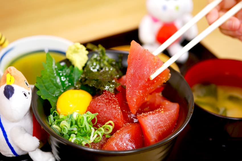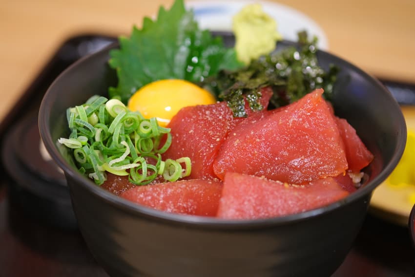 分厚く切られた⽣マグロがキラキラとき、新鮮さが⽬から伝わってきます。那智勝浦町では主にクロマグロ(本マグロ)、メバチマグロ、キハダマグロ、ビンチョウマグロが⽔揚げされます。特にクロマグロは鮮度が⾼く脂が乗って絶品であることから、東京の豊洲市場でも⾼値で取り引きされているほど⼤⼈気。