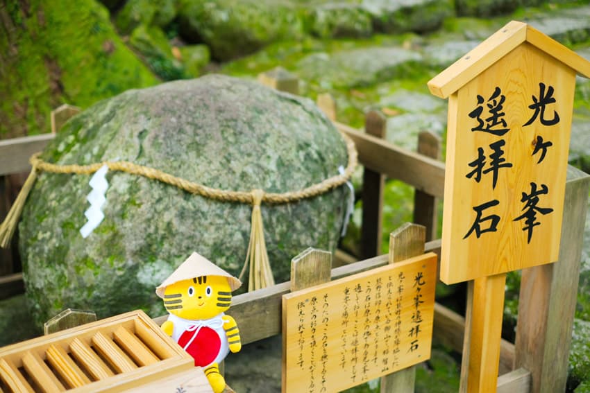 「光ヶ峯遥拝⽯」は熊野信仰の原点の場所だとか。なでる回数によって、縁結びや⾦運、厄除けなどご利益が変わるそう。滝をより近くで拝観したい⼈は、ぜひ「御滝拝所舞台」(参⼊料300円)へ。