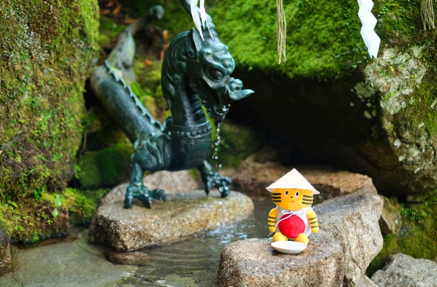 流下する⽔量は毎秒1トン程度。落⼝の岩盤の切れ⽬により、三筋に分かれて流れ落ちるため「三筋の滝」とも⾔われています。また那智の滝の⽔は「延命⻑寿の⽔」という⾔い伝えがあり、滝つぼの⽔を飲むことができるということで、ふねこもゴクリ!(神盃を使⽤する場合:初穂料200円)