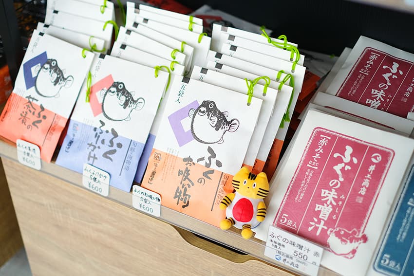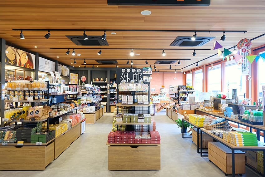 物産館には⼭⼝名物の外郎や夏みかんを使った加⼯品、ふぐを使⽤した⾷品、その他バラエティ豊かな商品が並んでいます。パッケージデザインがかわいいからお⼟産にGood!