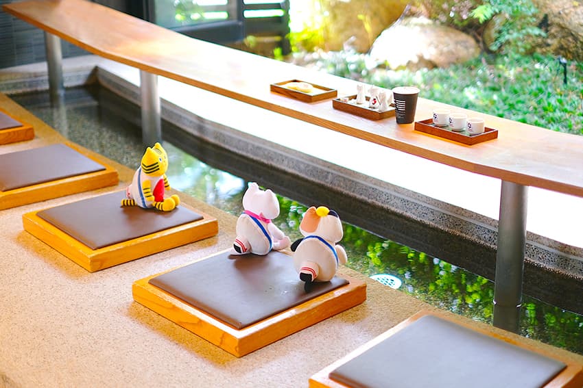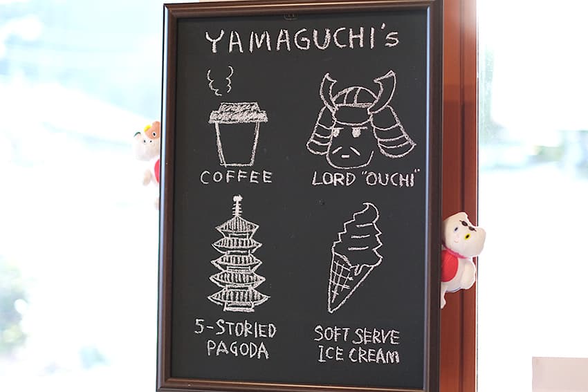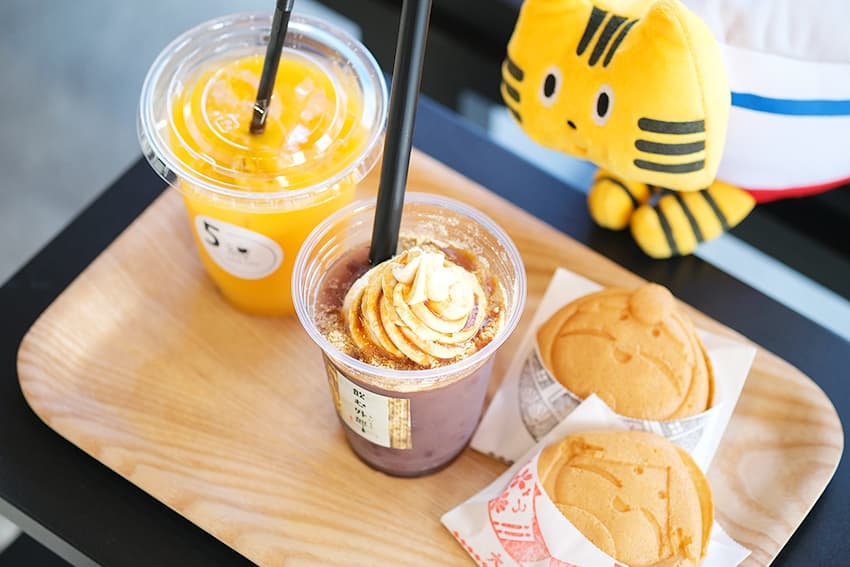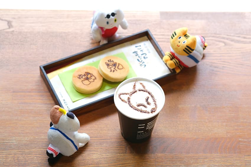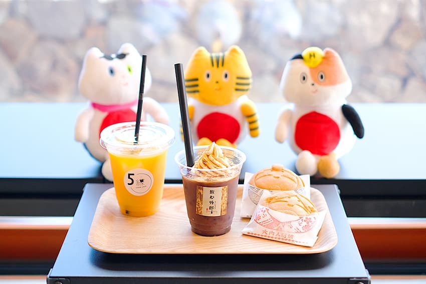 カフェでは⽩狐がモチーフのカフェラテやまんじゅう、⼭⼝銘菓・外郎(ういろう)のミニパフェなど、湯⽥温泉ならではの⼀品をどうぞ。
