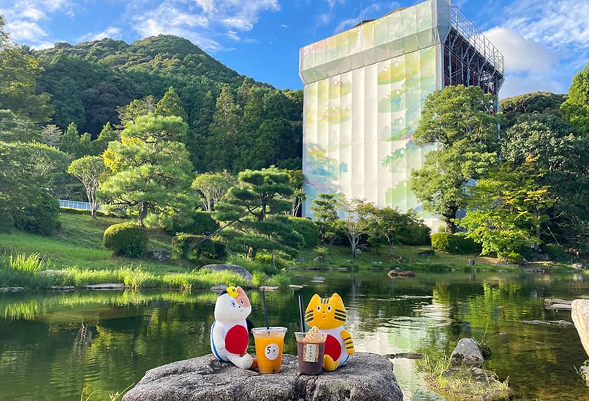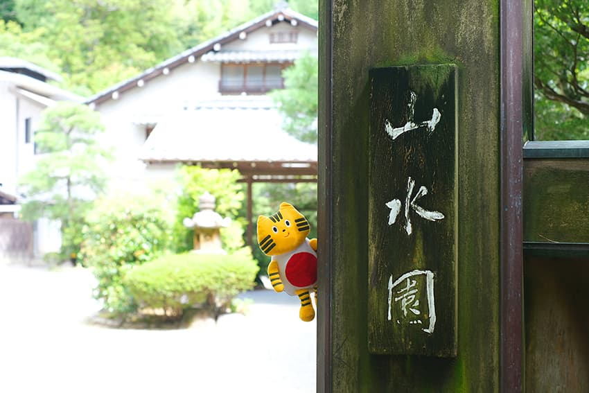 湯⽥温泉をさらに堪能するために、ふねこたちは“国登録有形⽂化財の宿”として有名な『名勝 ⼭⽔園』を訪れました。