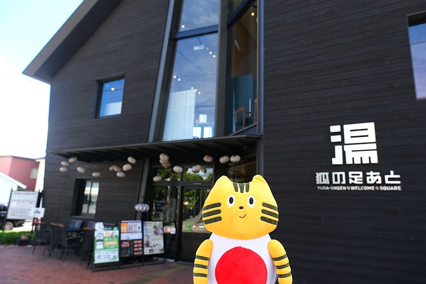 温泉街散策の始まりに訪れたいのが、湯⽥温泉観光回遊拠点施設『狐の⾜あと』。こちらは「観る」「⾷べる」「買い物する」をテーマに、観光にぴったりの最旬トピックを集めた情報発信施設です。