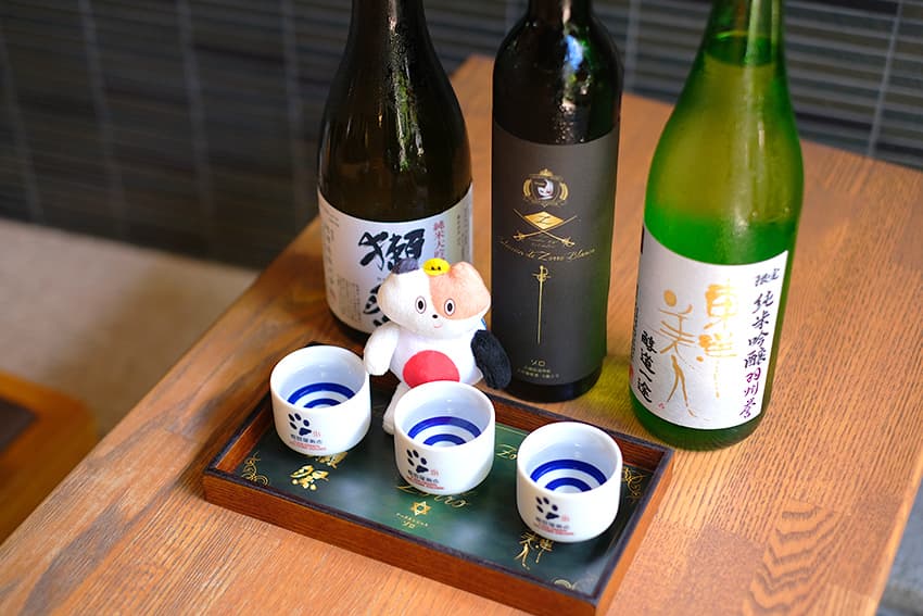 みけやんは利き酒に挑戦!「獺祭」「アークエンジェル ゾロ」「東洋美⼈」と、地酒の飲み⽐べを堪能しています♪
