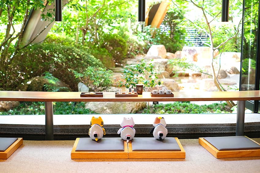 中庭の景⾊と⾜湯に癒されて、おいしいスイーツ&ドリンクに⾆⿎。⾄福の時間とはこのこと!
