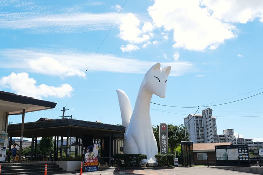 湯⽥温泉には「⽩狐伝説」があり、駅の横に巨⼤な⽩いキツネが鎮座しています…!!