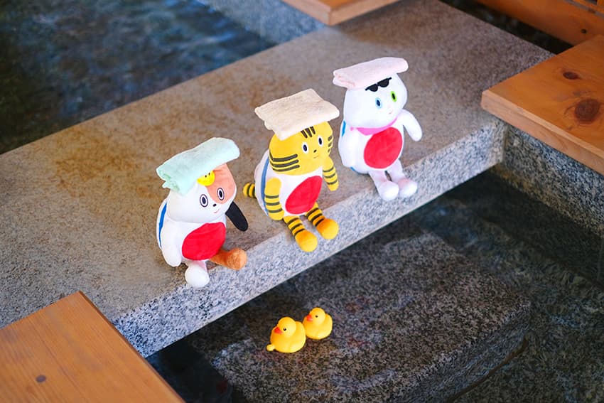 ⼭⽔園では温度の異なる3本の源泉を混ぜ合わせることで適温に調整し、源泉掛け流しの新鮮な温泉を提供。湯⽥温泉が誇る、無⾊透明で肌になじむ柔らかな泉質(アルカリ性単純泉)を存分に堪能できます。ふねこたちは「翠⼭の湯」で露天⾵呂、遠⾚外線サウナ、⽔⾵呂、ジェットバスなど、極楽タイムを謳歌中♪