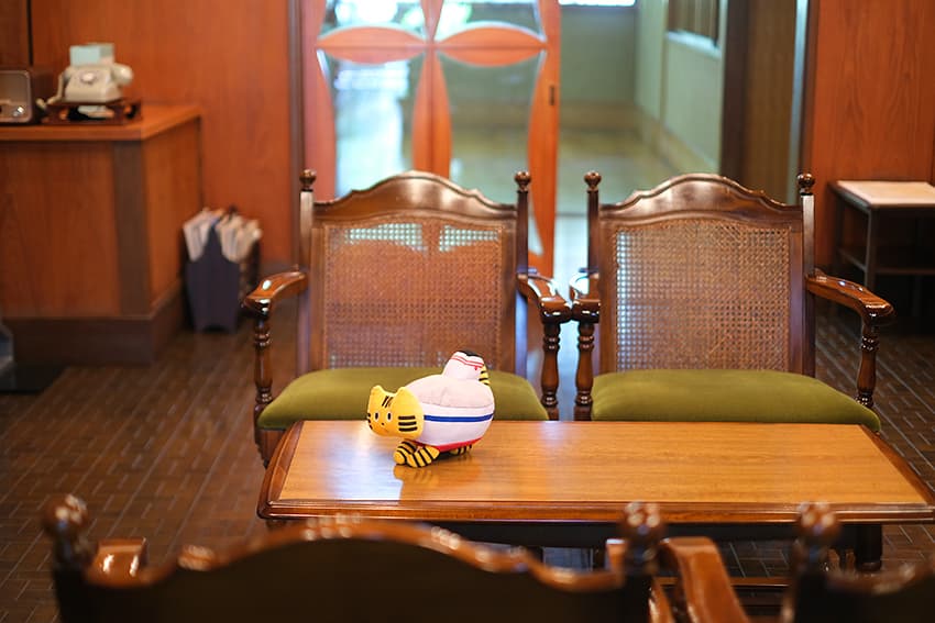 宿泊と温泉を楽しんだふねこは、旅館のロビーでしばし休憩。